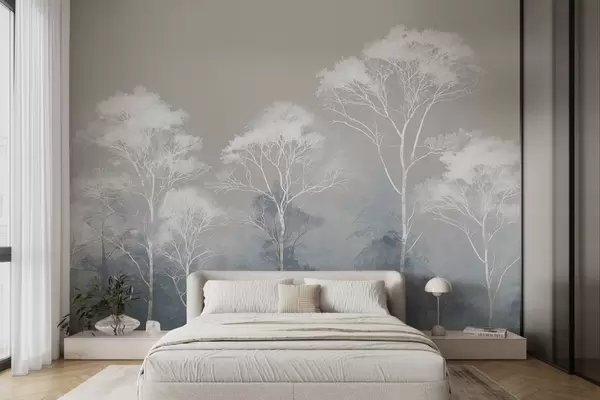 Papier peint photo Arbres minimalistes dans une palette bleu-gris, dans le brouillard N° w09448