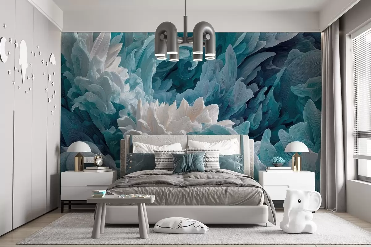 Papier peint photo Danse des pétales et des vagues de l'océan dans des tons bleus N° w09454