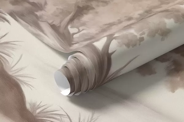 Papier peint photo Peinture paysagère texturée imitant une forêt avec de grands arbres et de l'herbe, couleurs douces et discrètes, scène apaisante N° w09474