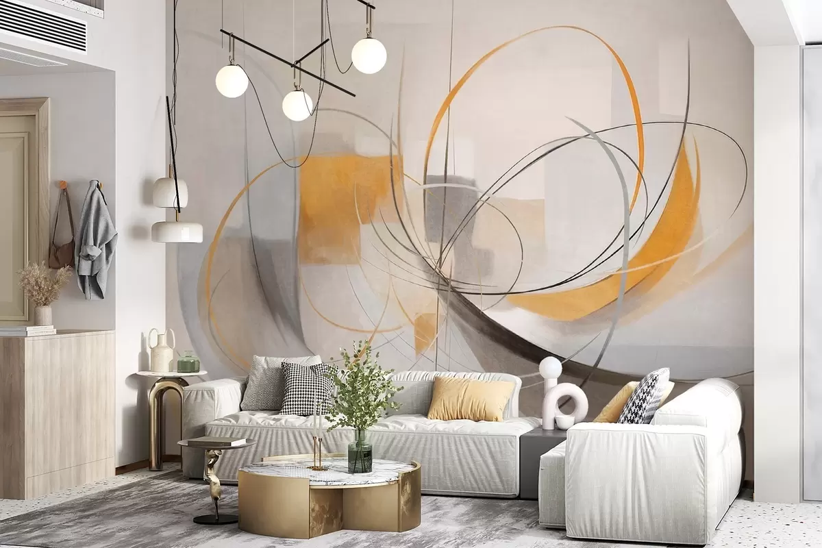 Papier peint photo Peinture moderne abstraite texturée avec des lignes courbes et des formes géométriques dans des tons de gris, blanc et orange N° w09476