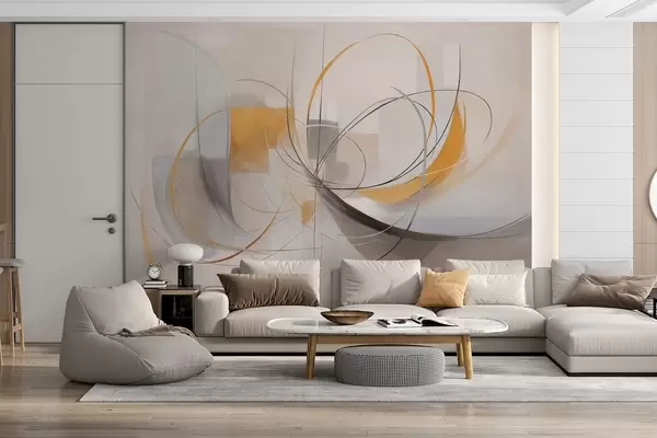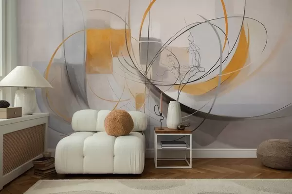 Papier peint photo Peinture moderne abstraite texturée avec des lignes courbes et des formes géométriques dans des tons de gris, blanc et orange N° w09476