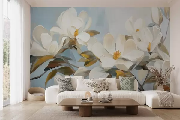 Papier peint photo Magnolias blancs avec feuilles vertes sur fond bleu clair avec imitation de coups de pinceau abstraits N° w09478