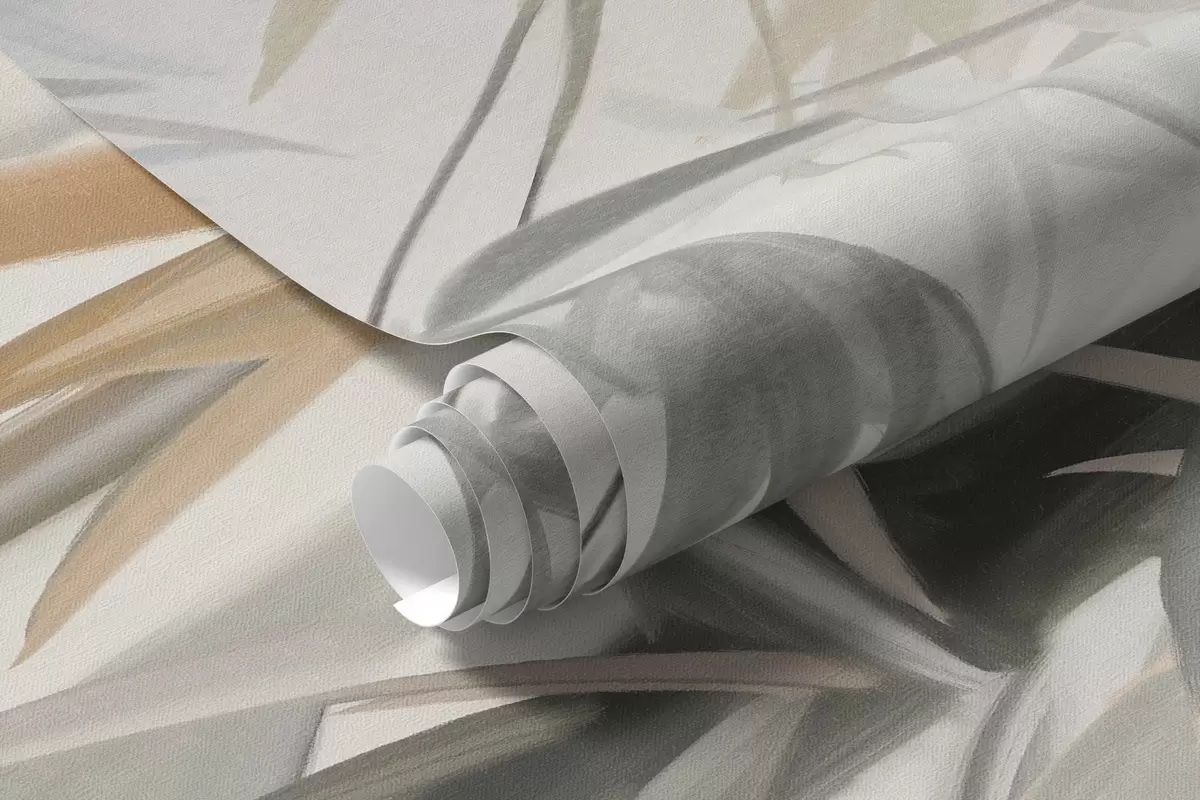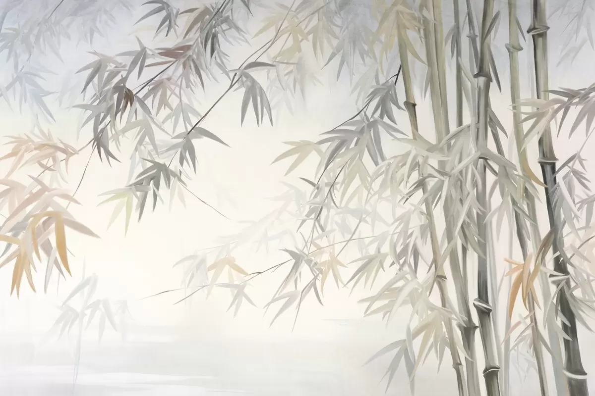Papier peint photo Tiges et feuilles de bambou texturées dans une palette de couleurs douces et discrètes de gris, blanc et crème, composition minimaliste N° w09485
