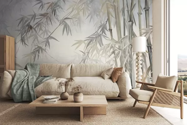 Papier peint photo Tiges et feuilles de bambou texturées dans une palette de couleurs douces et discrètes de gris, blanc et crème, composition minimaliste N° w09485