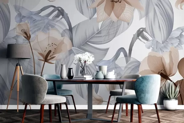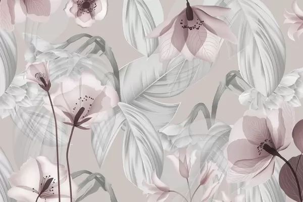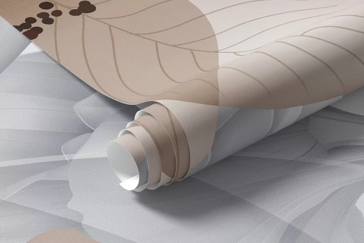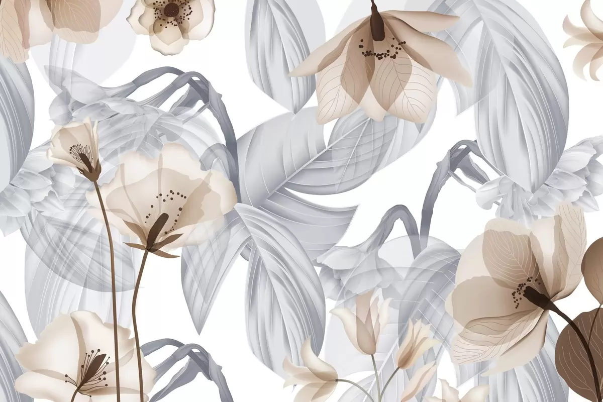Papier peint photo Fleurs brunes et feuilles grises, fond botanique floral, design élégant, couleurs douces, détails légers et délicats N° w09497v1