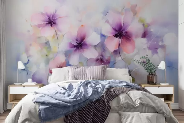 Papier peint photo Fleurs printanières aquarellées dans des tons roses et violets N° w09502