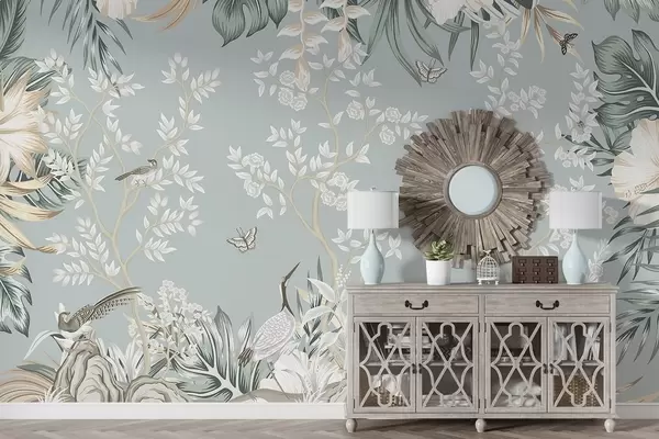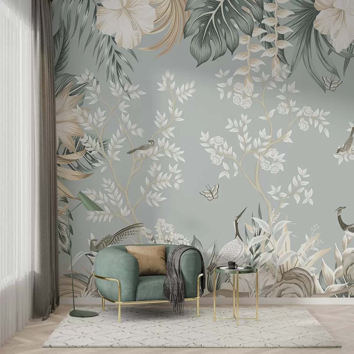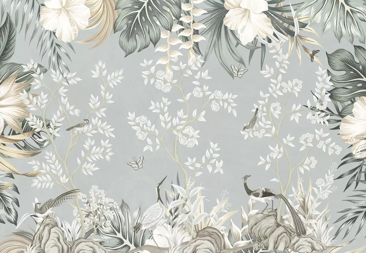 Papier peint photo Art pastel tropical texturé avec des oiseaux, des papillons, des fleurs d'hibiscus, des feuilles de palmier et des arbres sur fond bleu clair. N° w09528