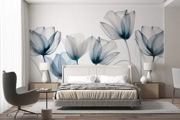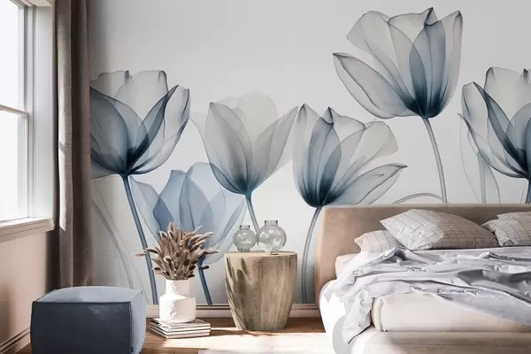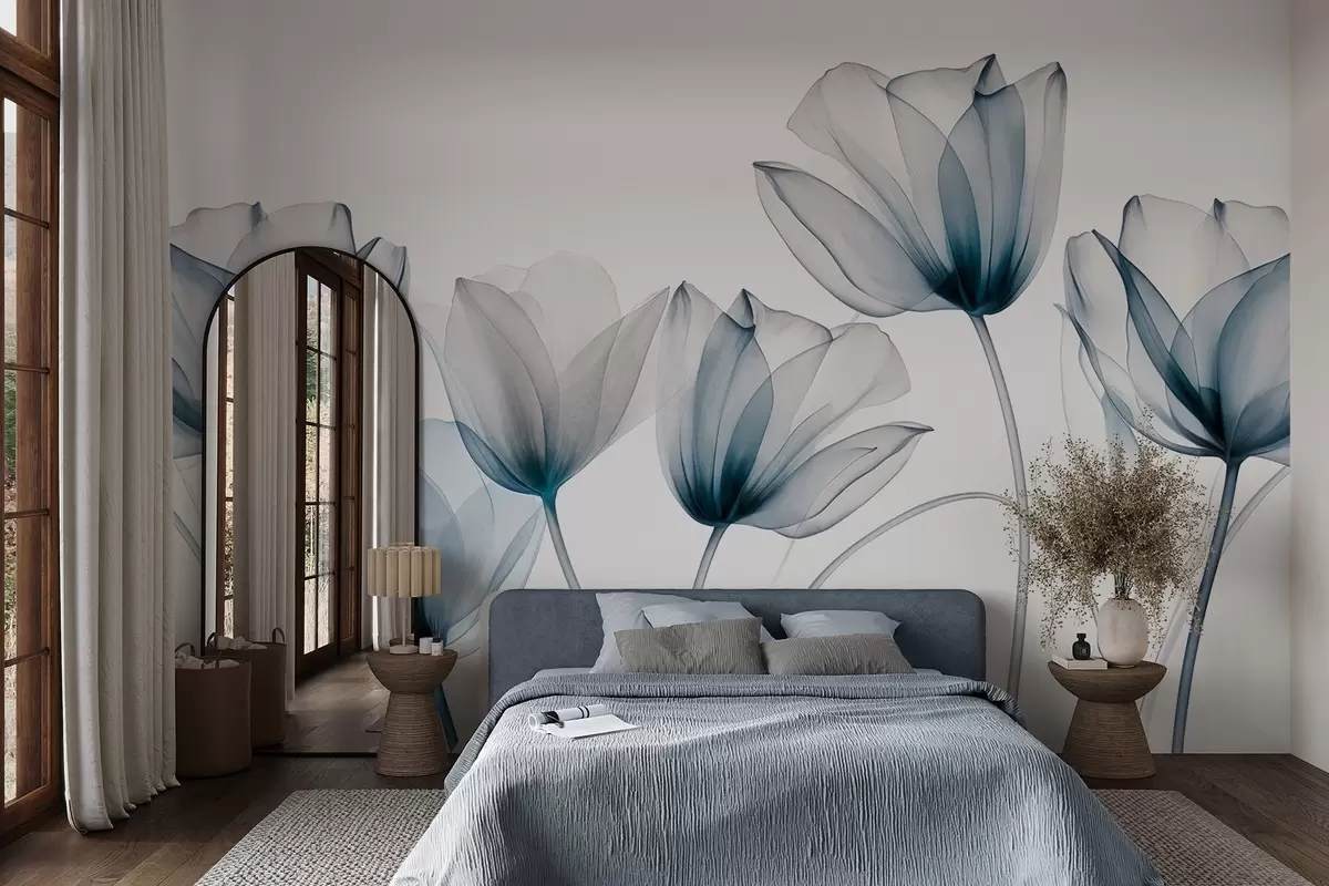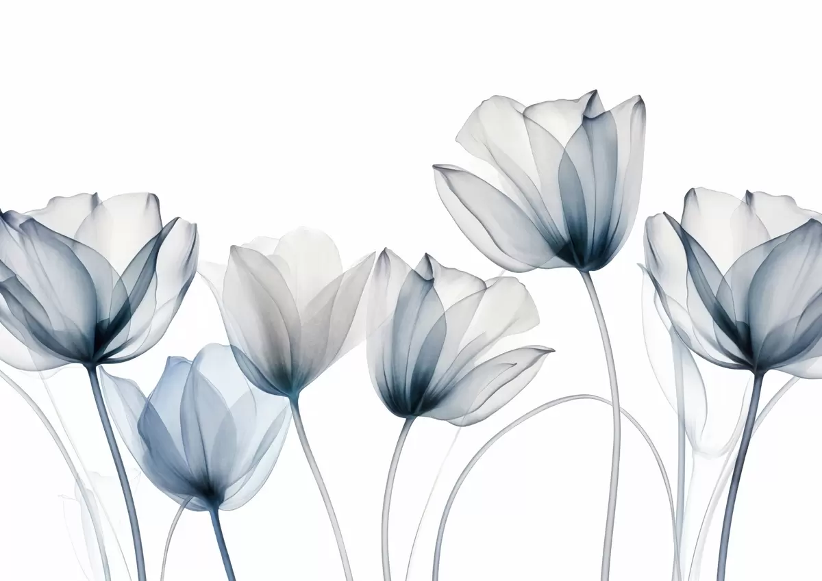 Papier peint photo Fleurs de tulipes bleues et blanches translucides à longues tiges, sur fond clair, art floral délicat et texturé N° w09538