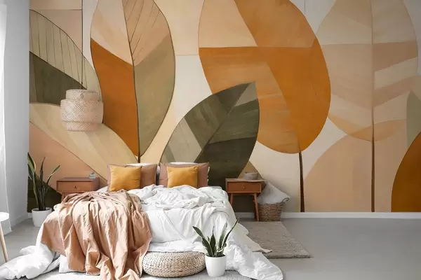 Papier peint photo Feuilles abstraites de grande taille dans des tons orange, marron et vert, texturées, disposées sur un fond clair. N° w09539