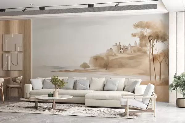 Papier peint photo Paysage avec un château sur une colline près de la mer, une plage de sable au premier plan, couleurs douces, art texturé N° w09540