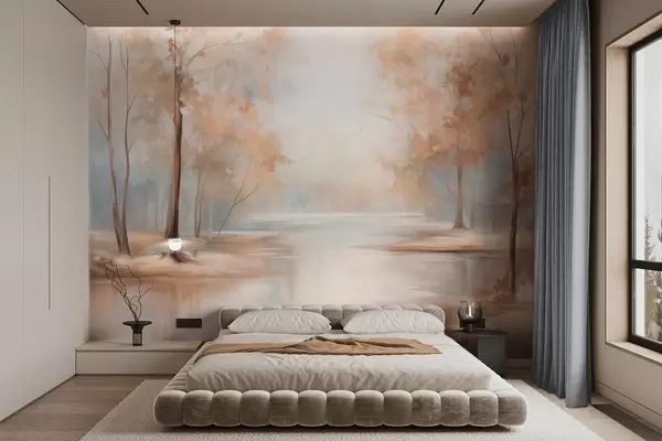 Papier peint photo Paysage automnal texturé avec des arbres et une rivière, couleurs douces, atmosphère légère et aérienne, scène paisible et tranquille. N° w09541