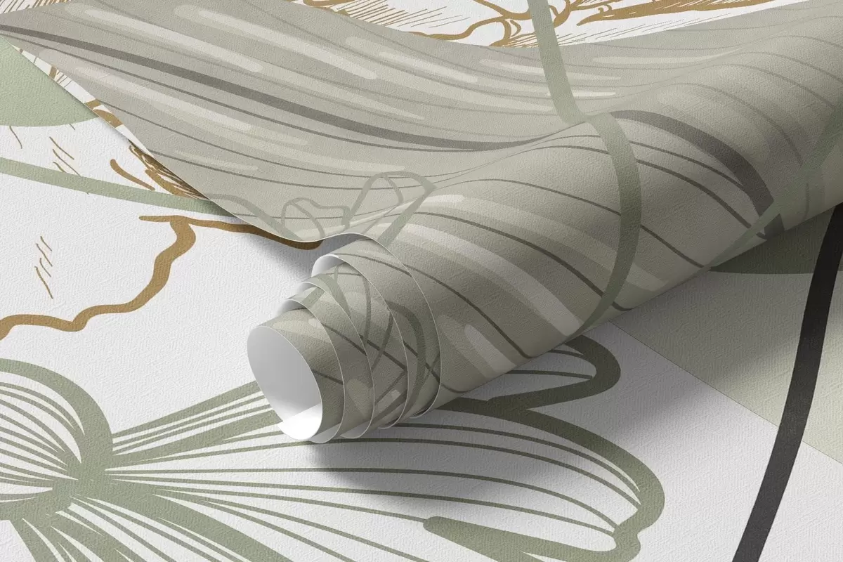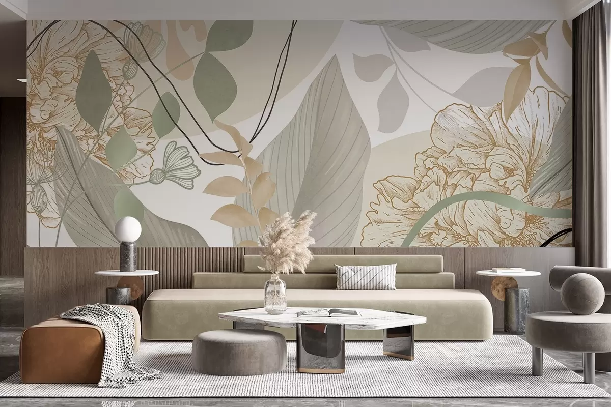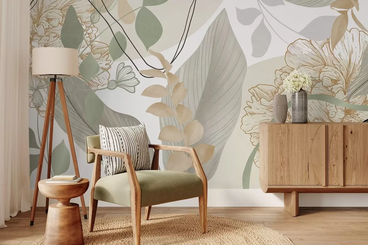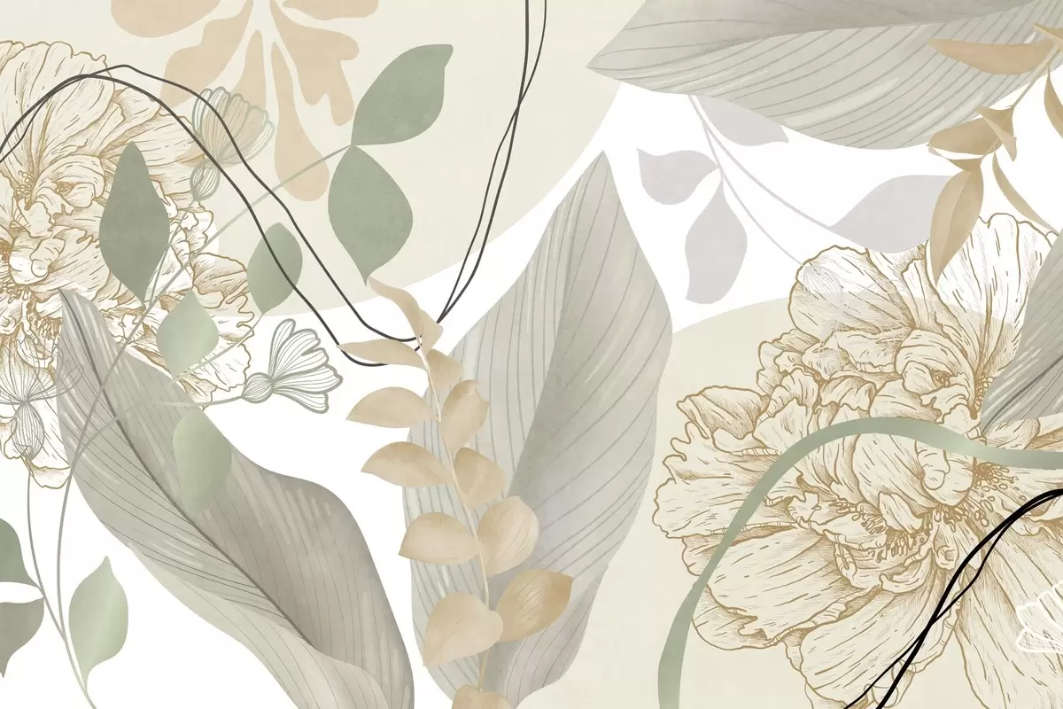 Papier peint photo Imprimé floral abstrait avec de grandes feuilles dans des tons de vert et de jaune discrets, rehaussées de fines lignes noires et de contours floraux blancs. N° w09544v2