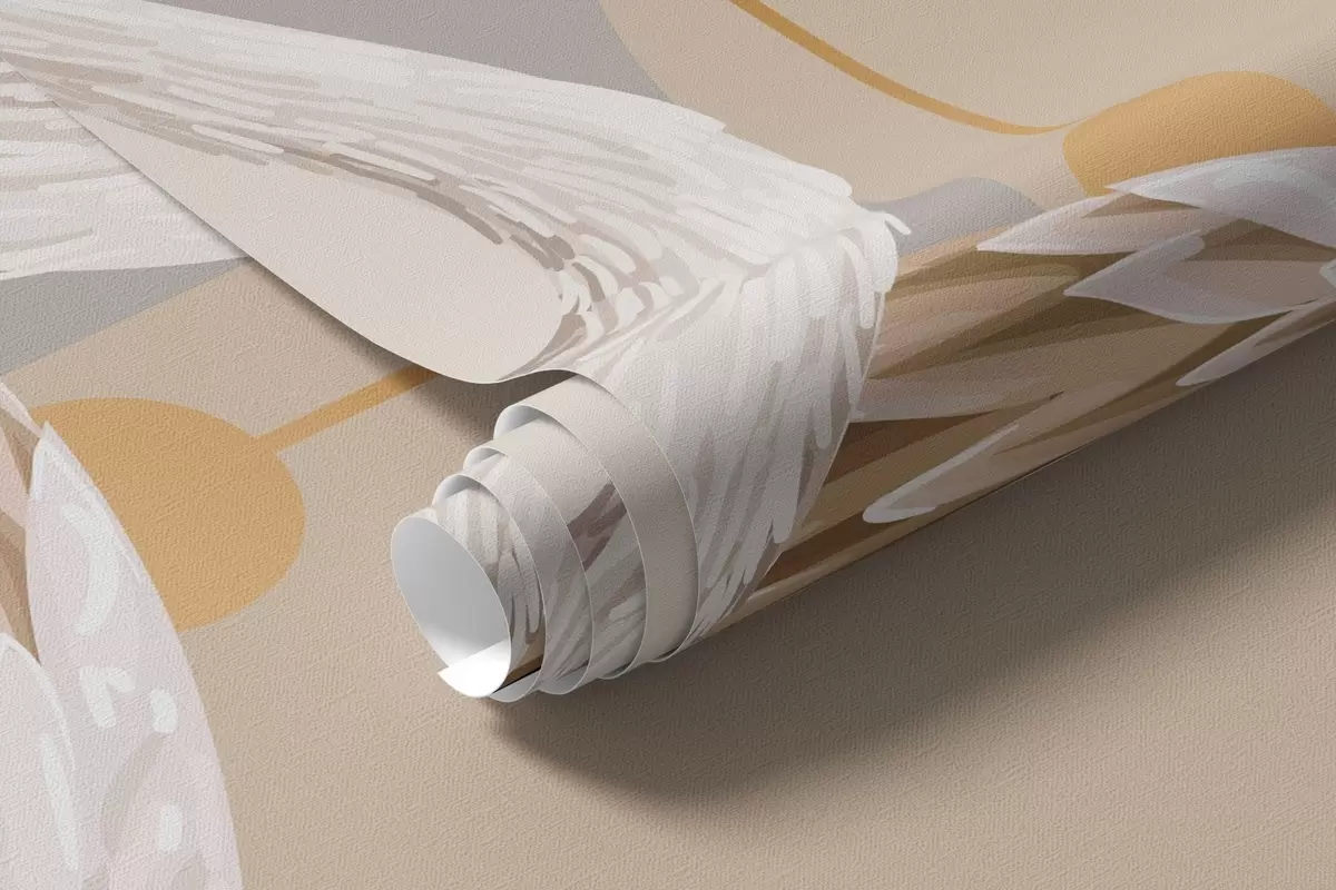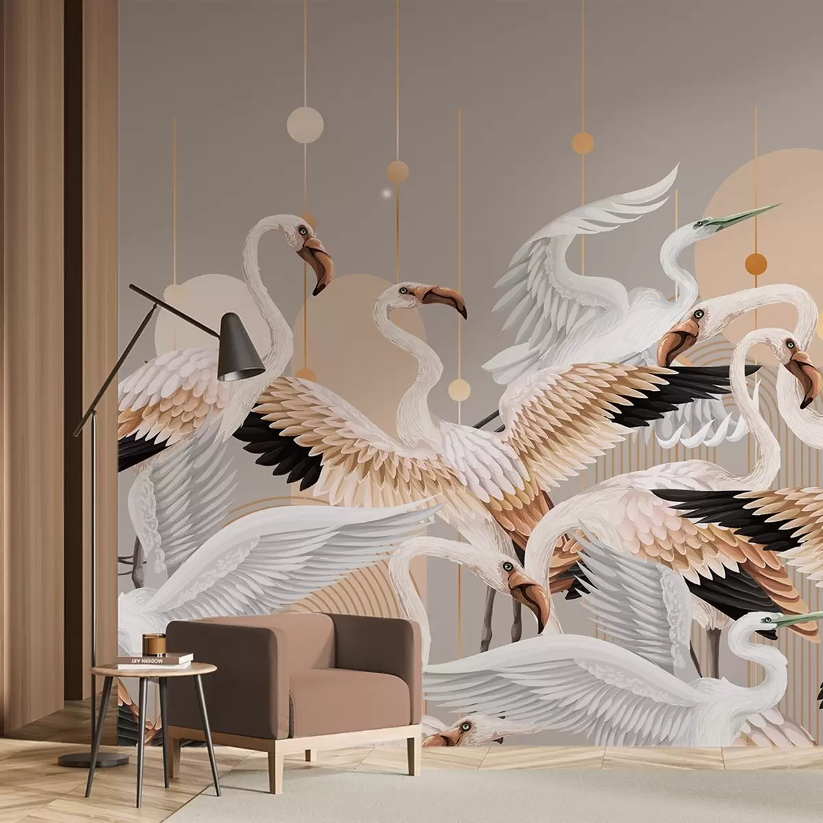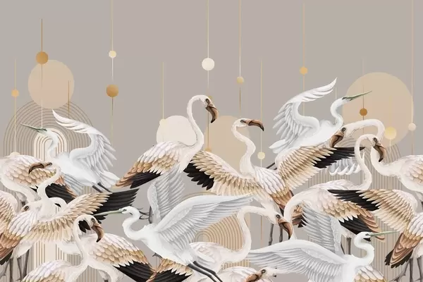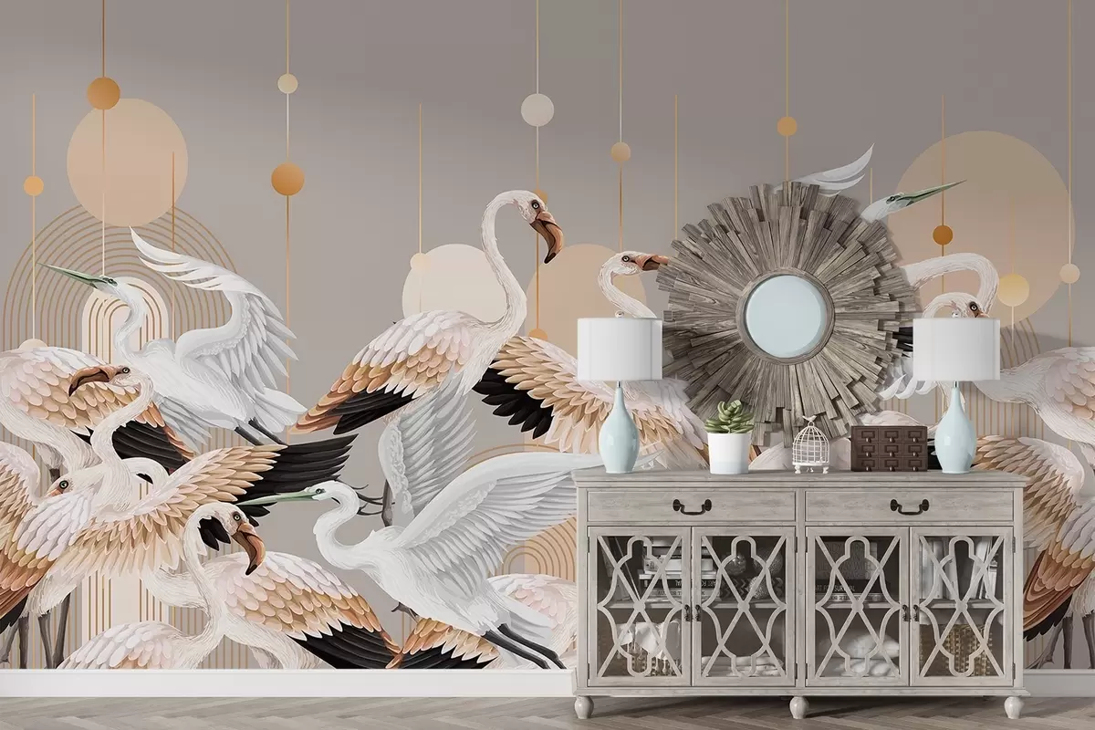 Papier peint photo Un groupe de flamants roses blancs aux ailes délicates, sur un fond neutre avec des lignes et des cercles jaunes. N° w09546v1