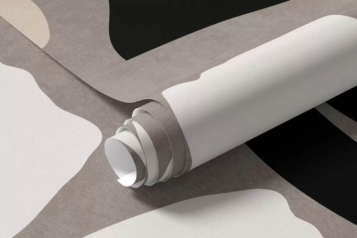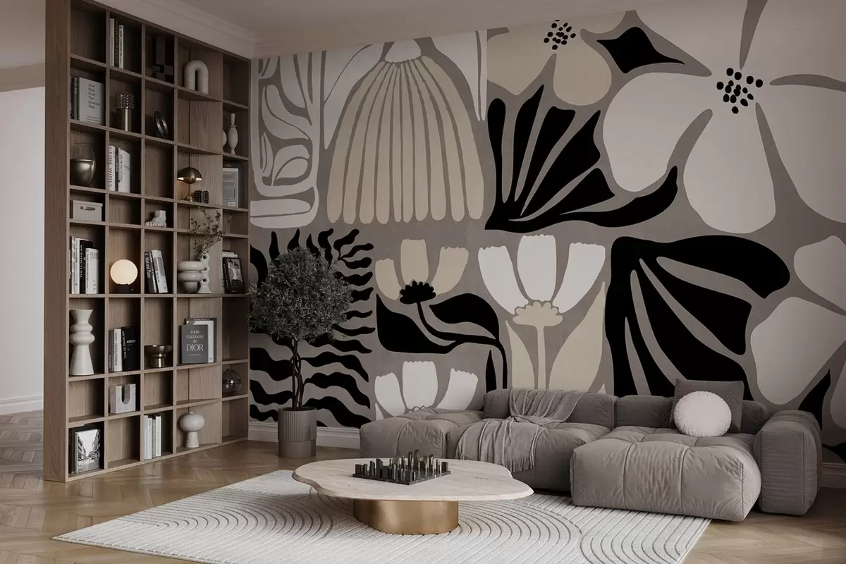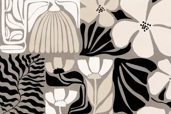 Papier peint photo Fleurs et feuilles stylisées modernes et minimalistes, dans des tons beige, noir et blanc, texturées sur fond gris. N° w09547