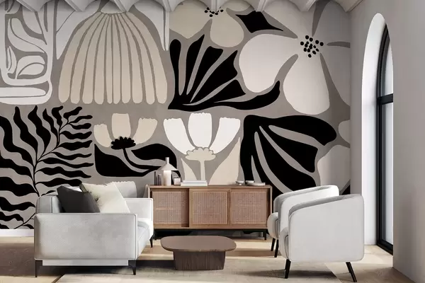 Papier peint photo Fleurs et feuilles stylisées modernes et minimalistes, dans des tons beige, noir et blanc, texturées sur fond gris. w09547
