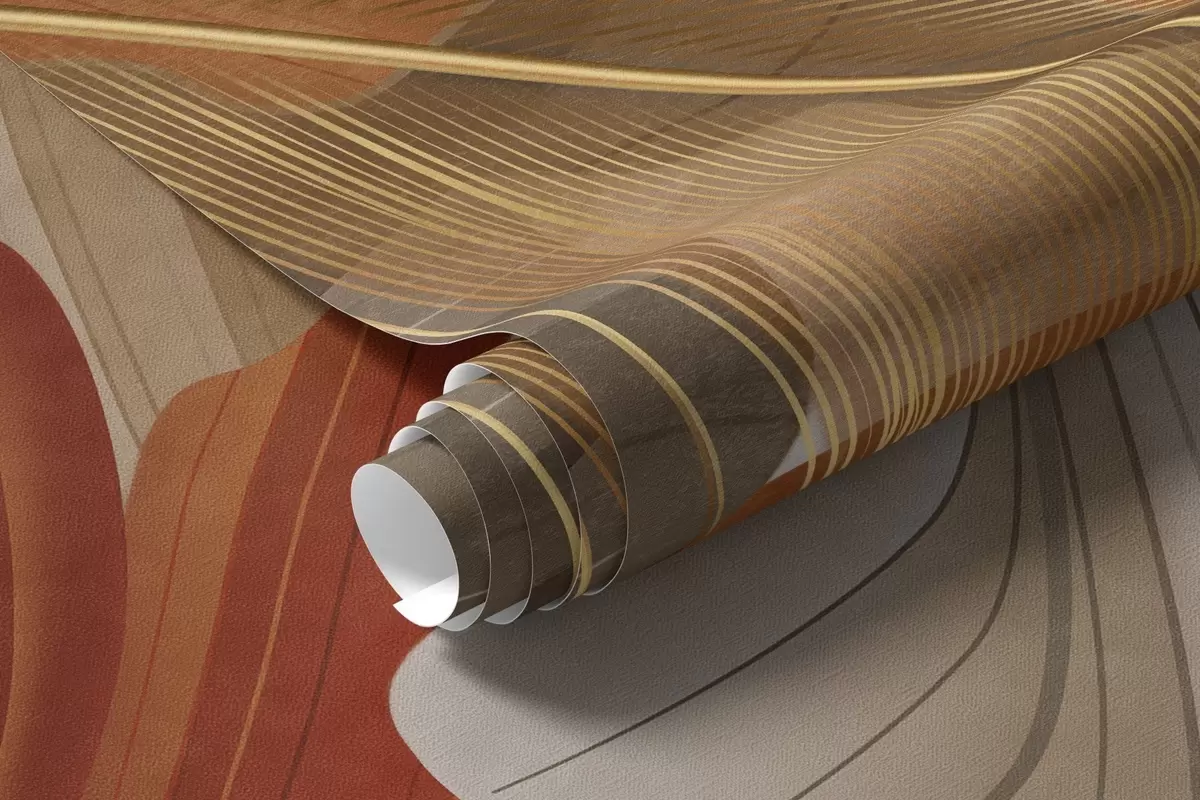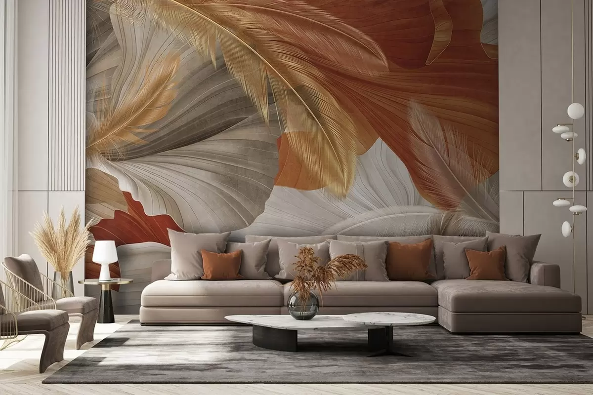 Papier peint photo Formes abstraites texturées, fluides, de couleur crème et rouille, ornées de délicates plumes jaunes, beiges et brunes. N° w09549