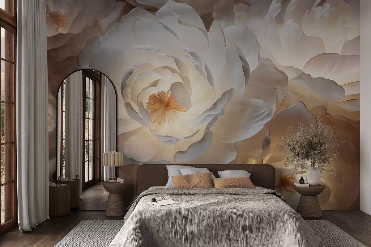 Papier peint photo Grandes fleurs de pivoine fantaisie blanches au cœur jaune, éclairage tamisé et pétales délicats et texturés superposés. N° w09550