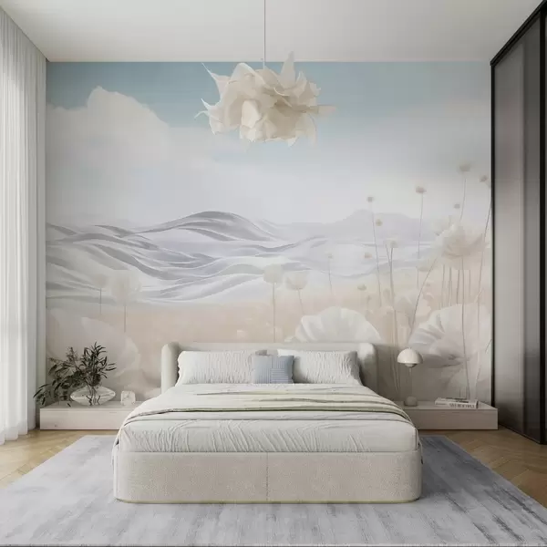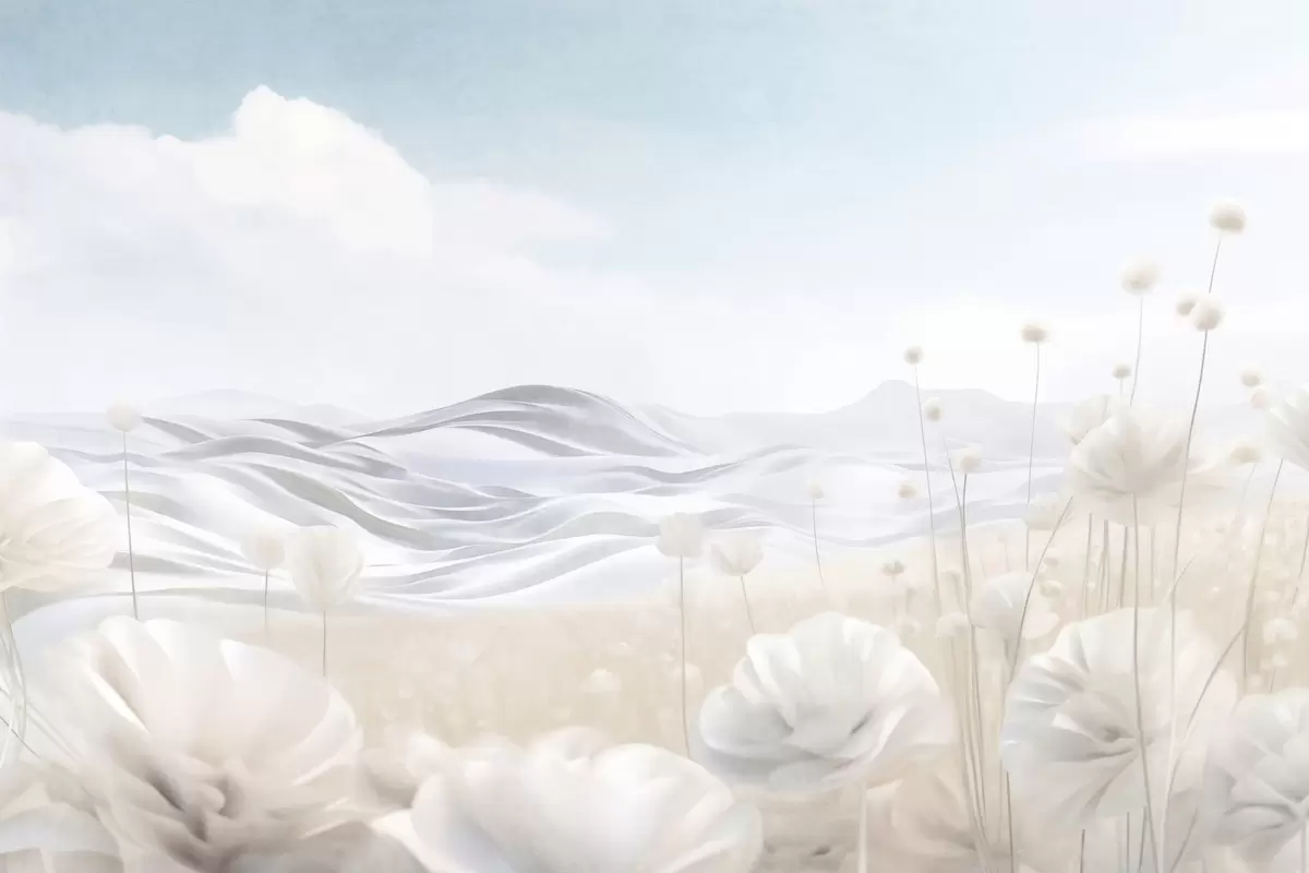 Papier peint photo Champ texturé de coquelicots crémeux avec des collines ondulantes sous un ciel bleu pâle parsemé de nuages cotonneux, couleurs pastel N° w09553