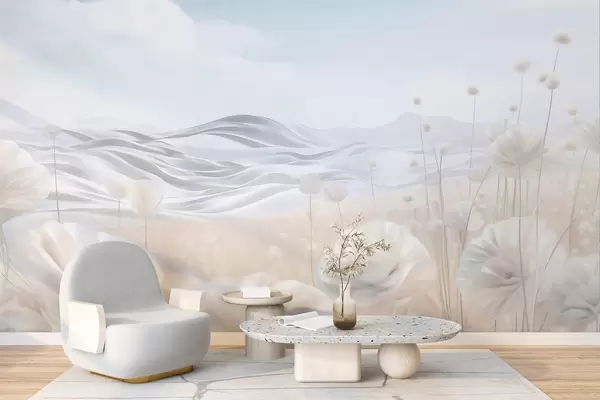 Papier peint photo Champ texturé de coquelicots crémeux avec des collines ondulantes sous un ciel bleu pâle parsemé de nuages cotonneux, couleurs pastel N° w09553