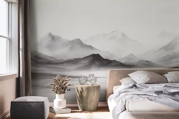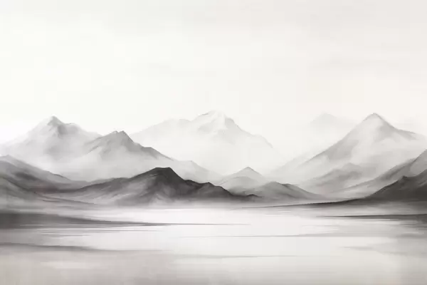 Papier peint photo Paysage monochrome texturé avec des montagnes brumeuses et un lac au premier plan N° w09555