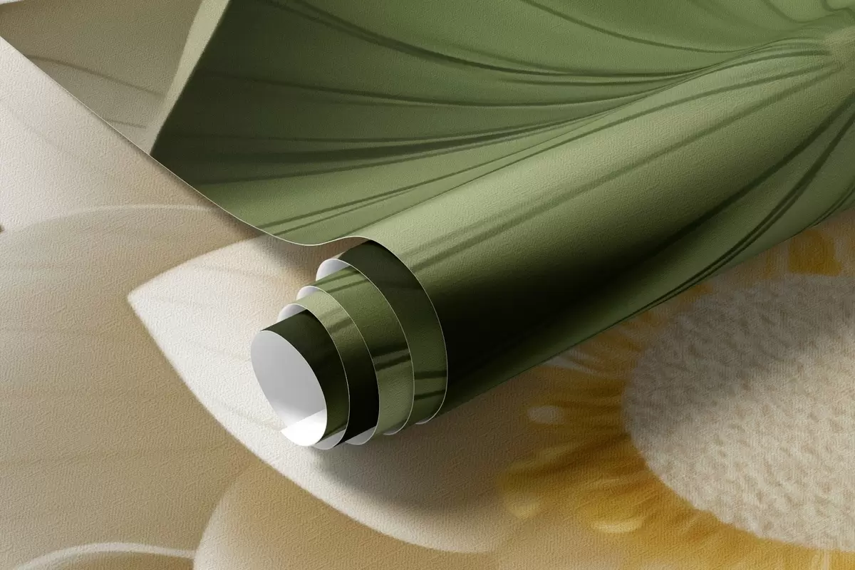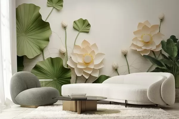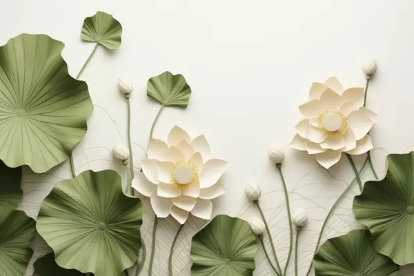 Papier peint photo Fleurs de lotus en 3D avec feuilles vertes texturées, style minimaliste N° w09560