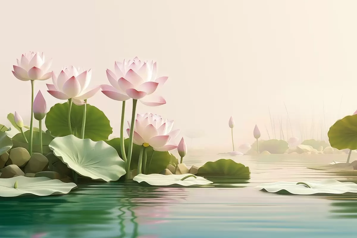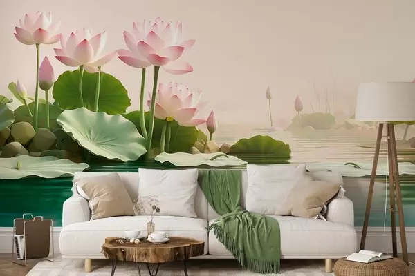 Papier peint photo Fleurs de lotus roses sur l'eau, un paysage tropical paisible N° w09561