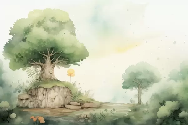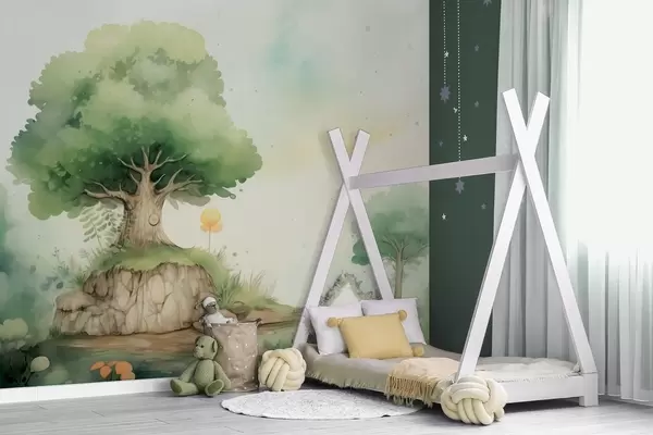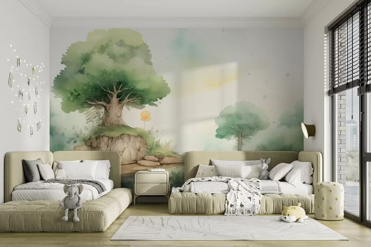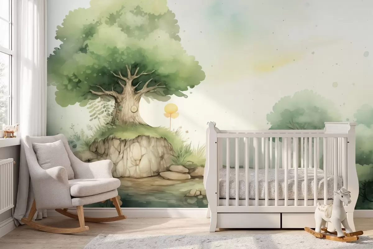 Papier peint photo Un monde féérique d'enfance dans un paysage forestier verdoyant, style aquarelle N° w09566