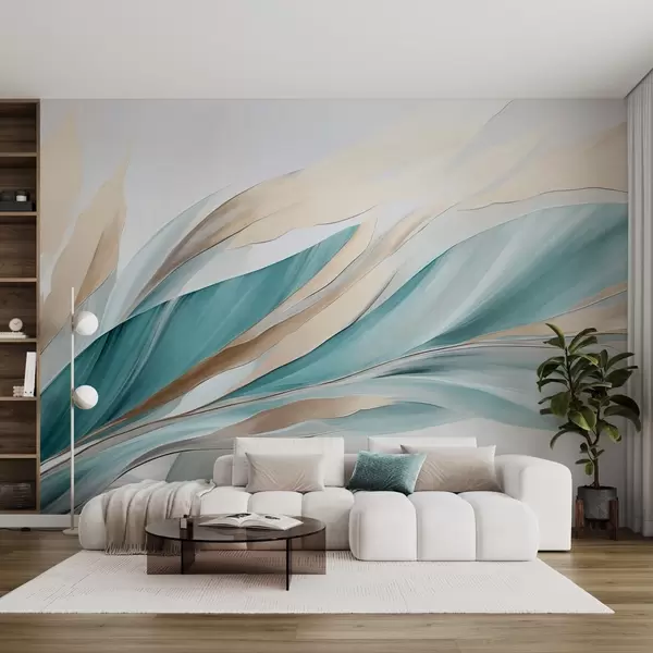 Papier peint photo Vagues abstraites fluides bleu sarcelle et jaunes, avec des formes et des lignes fines, sur fond blanc, art texturé N° w09585