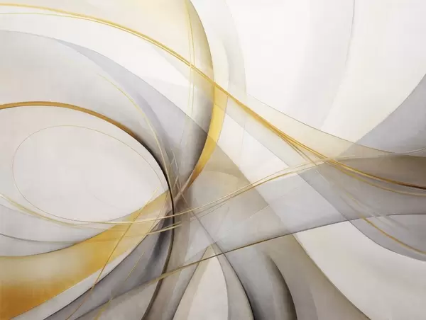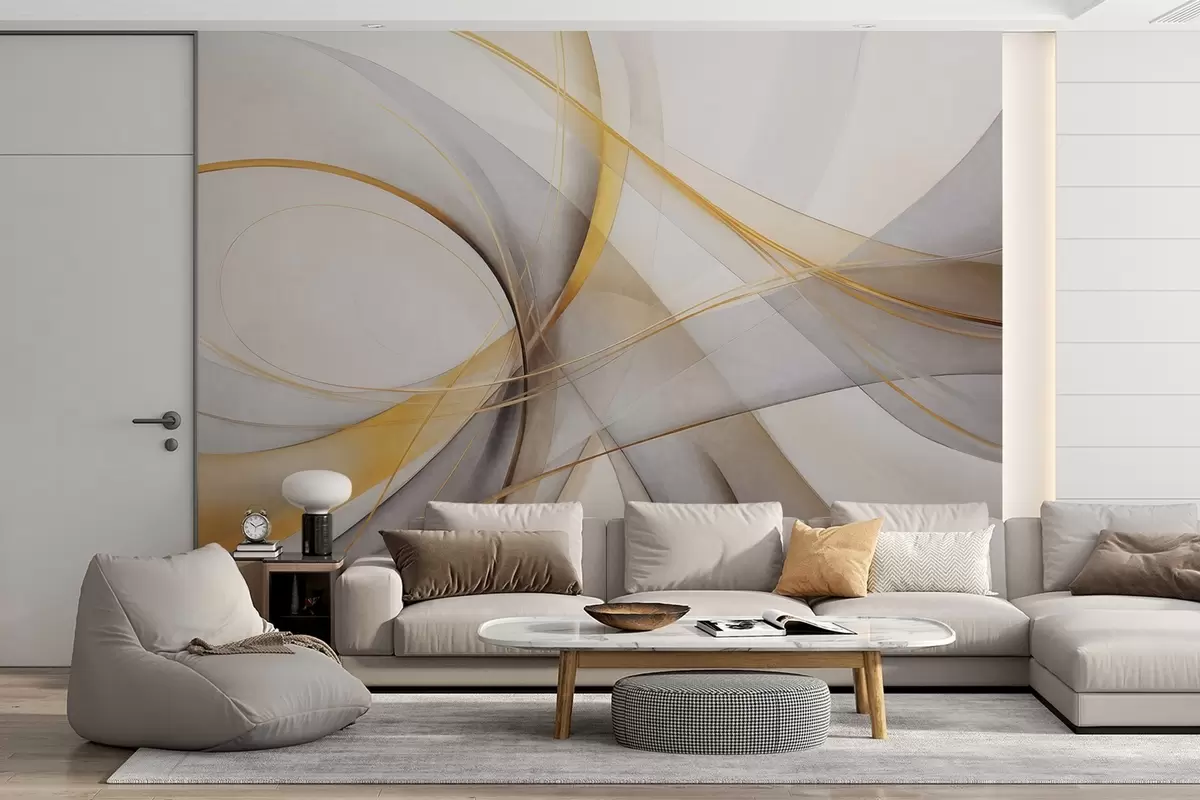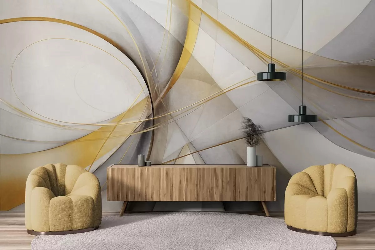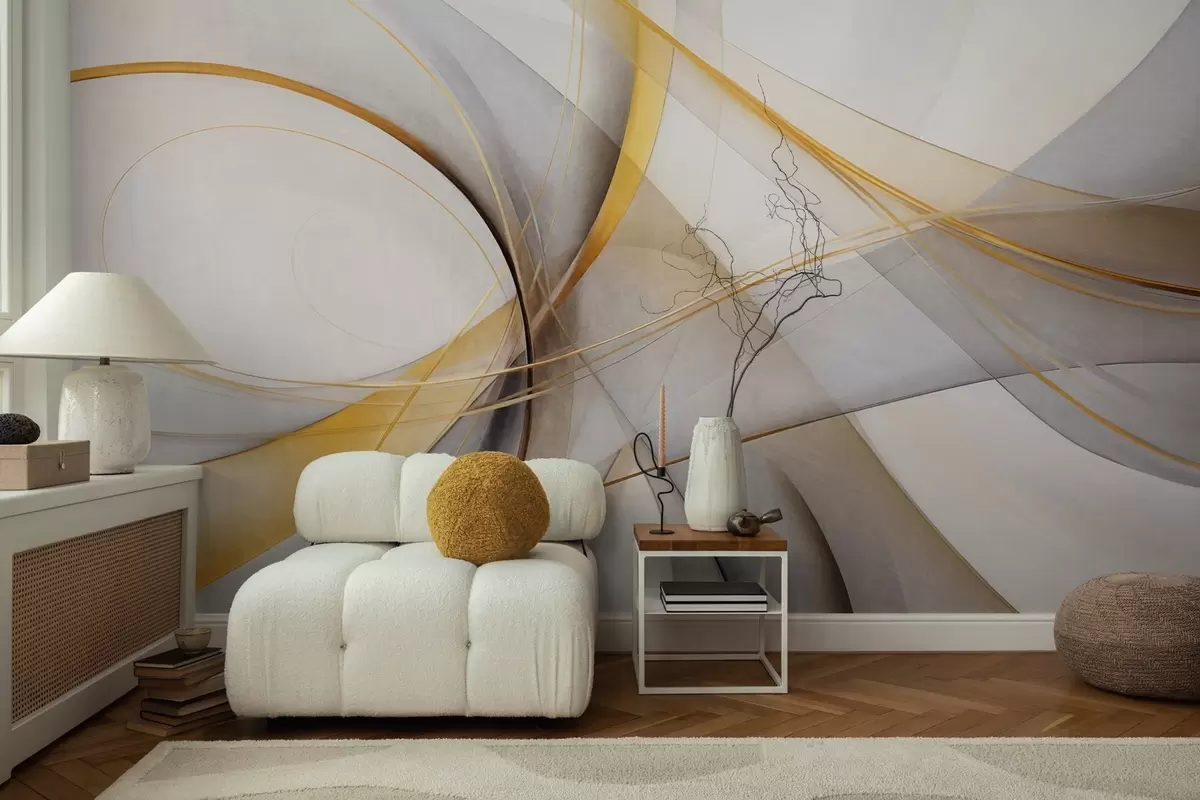 Papier peint photo Lignes abstraites fluides en jaune et blanc sur fond gris, avec une impression de mouvement et de profondeur, art moderne N° w09587