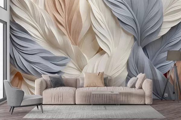 Papier peint photo Plumes abstraites et superposées dans des tons crème, beige et bleu clair, avec un aspect texturé et organique. N° w09603