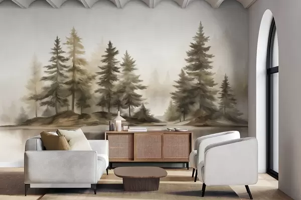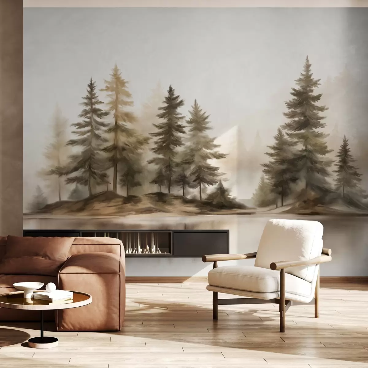 Papier peint photo Une forêt brumeuse texturée avec de grands pins peints en imitation N° w09610