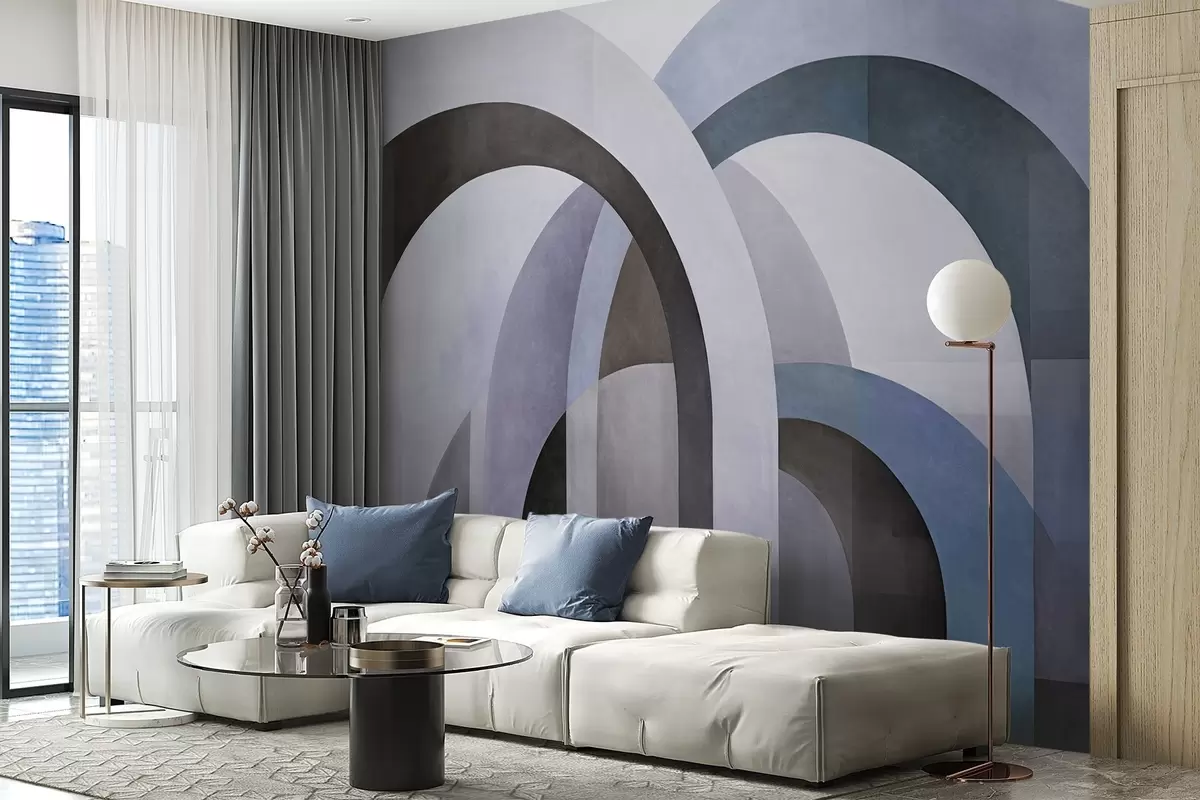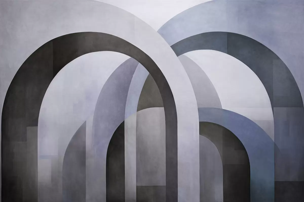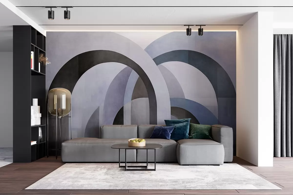Papier peint photo Arcs géométriques abstraits texturés dans des tons de bleu, noir et gris, un design architectural moderne en couches. N° w09611v1