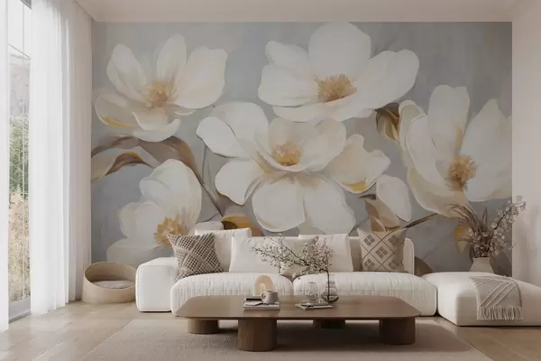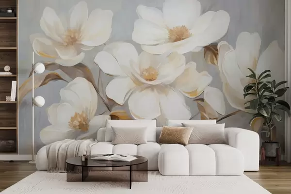 Papier peint photo Une imitation picturale texturée de plusieurs fleurs de magnolia blanches sur un fond pastel discret. N° w09612