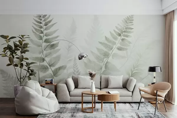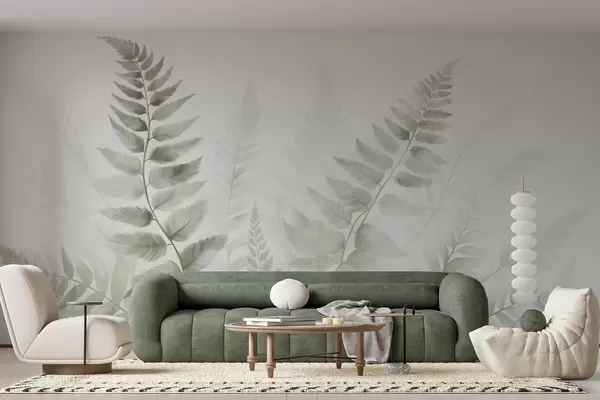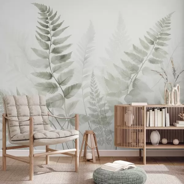 Papier peint photo Fougères séchées texturées dans différentes nuances de vert, sur fond clair et doux, dans un style aquarelle. N° w09615v1