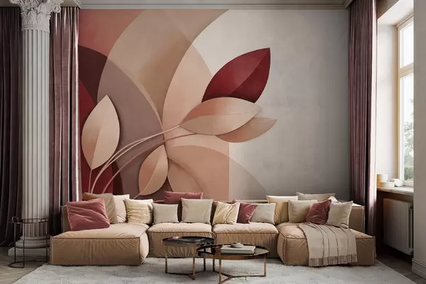 Papier peint photo Branche abstraite texturée avec des feuilles dans les tons marron, beige et rouge, sur un fond de formes abstraites. N° w09618