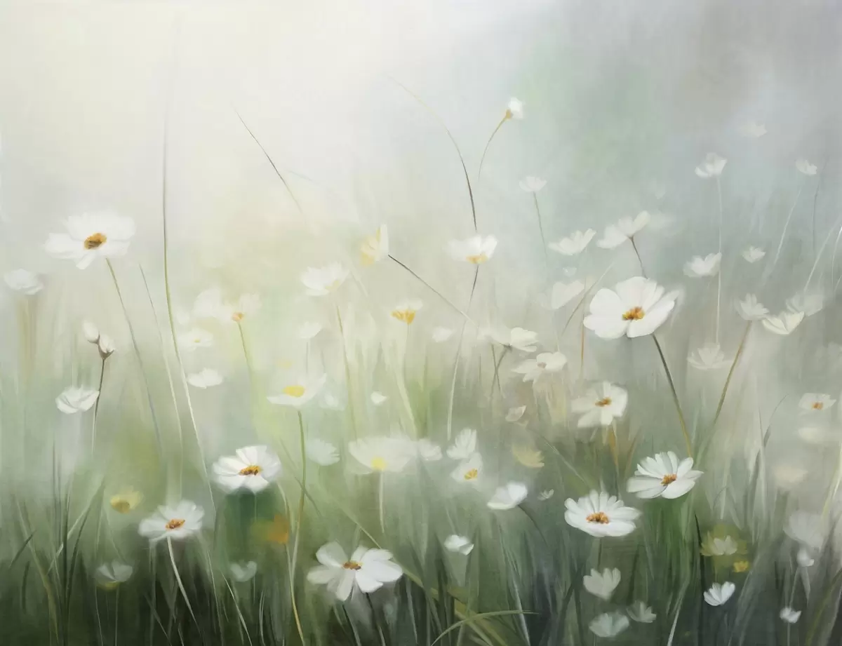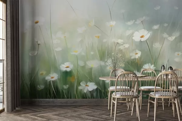 Papier peint photo Champ abstrait de marguerites blanches avec de l'herbe verte et un arrière-plan doux et brumeux dans un style pictural N° w09619