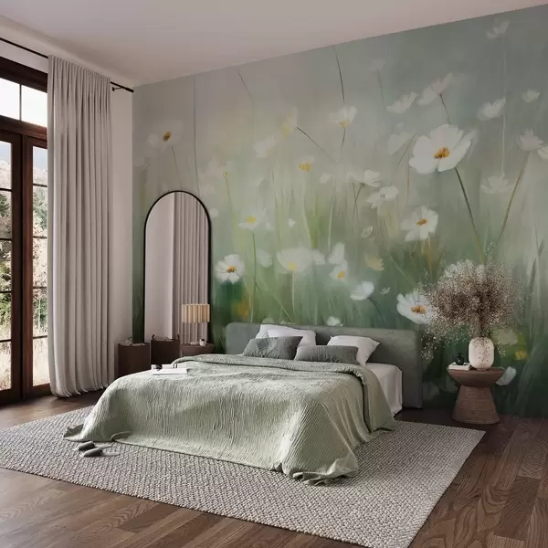 Papier peint photo Champ abstrait de marguerites blanches avec de l'herbe verte et un arrière-plan doux et brumeux dans un style pictural N° w09619