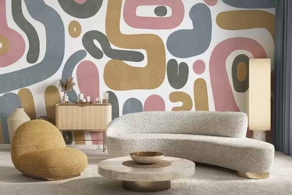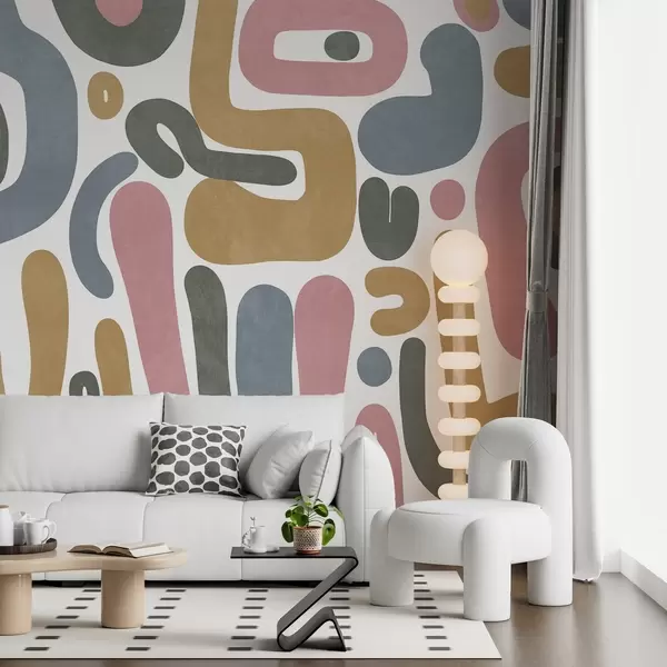 Papier peint photo Formes abstraites texturées dans des tons rose pastel, bleu pâle, jaune moutarde et gris sur fond blanc, art moderne. N° w09620