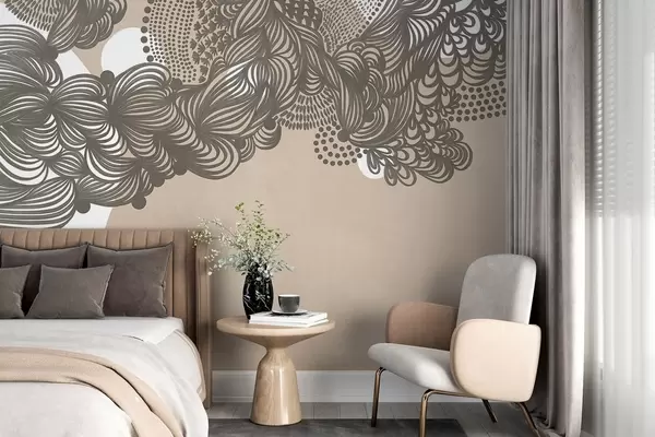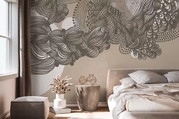Papier peint photo Motif abstrait texturé sur fond beige, avec des lignes complexes et des textures pointillées. N° w09621