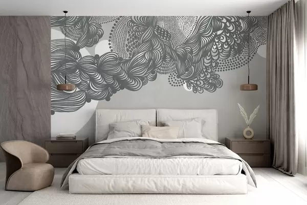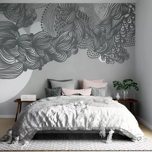 Papier peint photo Motif abstrait texturé sur fond gris, avec des lignes complexes et des textures pointillées. N° w09621v1