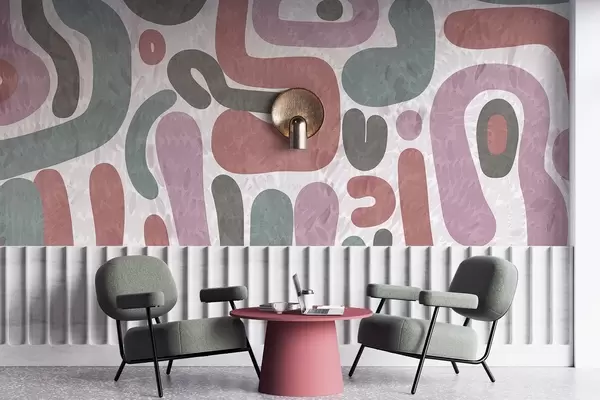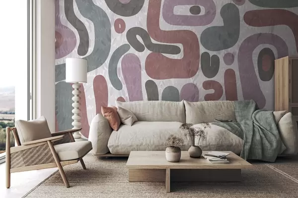 Papier peint photo Formes abstraites texturées dans des tons roses, verts et gris discrets, sur un fond texturé d'art moderne N° w09622