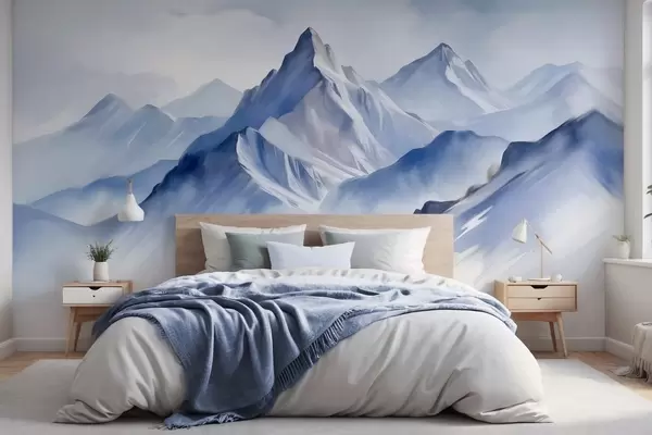 Papier peint photo Montagnes enneigées texturées avec un effet aquarelle doux et une palette de bleus et de blancs N° w09630