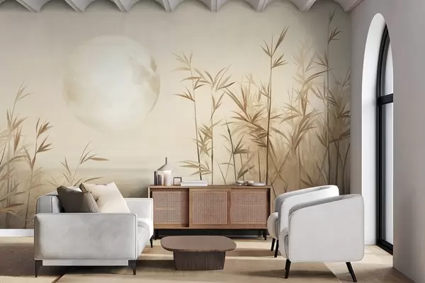 Papier peint photo Paysage texturé avec de grands roseaux, un lac et une lune pâle dans un ciel brumeux N° w09631