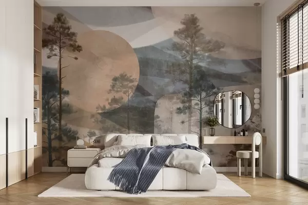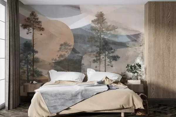 Papier peint photo De grands pins dans un paysage aux textures discrètes, avec des formes circulaires abstraites et des montagnes superposées dans des tons ocres. N° w09636