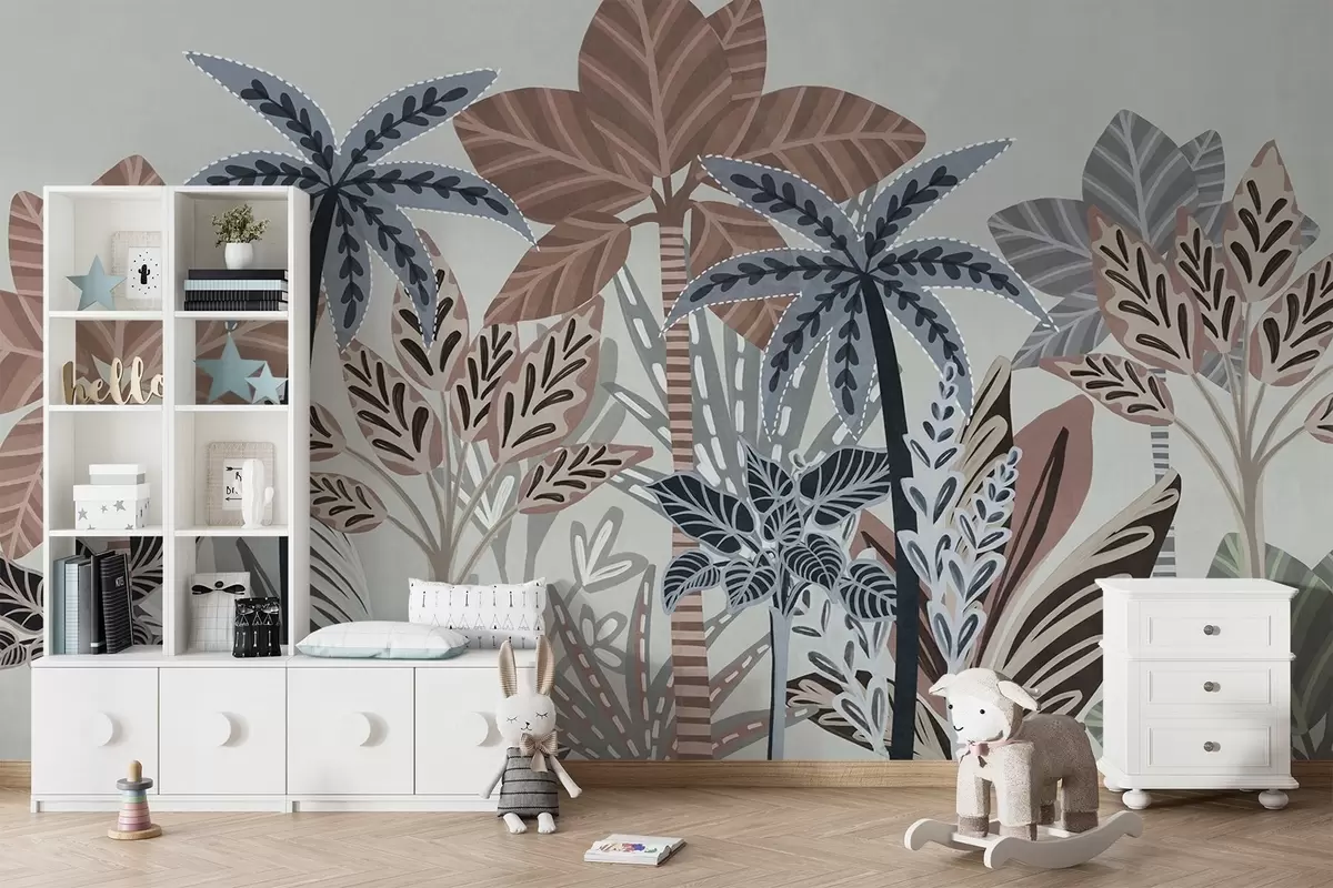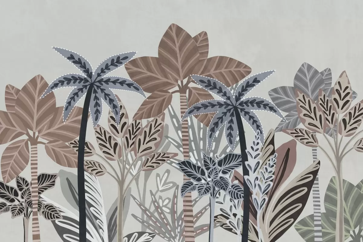 Papier peint photo Plantes tropicales texturées et palmiers aux couleurs douces dans un style bohème décoratif sur fond gris N° w09639v1