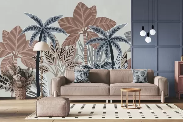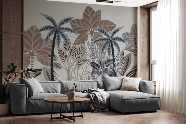 Papier peint photo Plantes tropicales texturées et palmiers aux couleurs douces dans un style bohème décoratif sur fond gris N° w09639v1