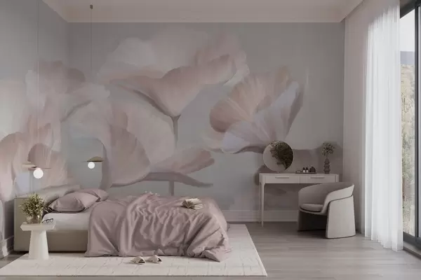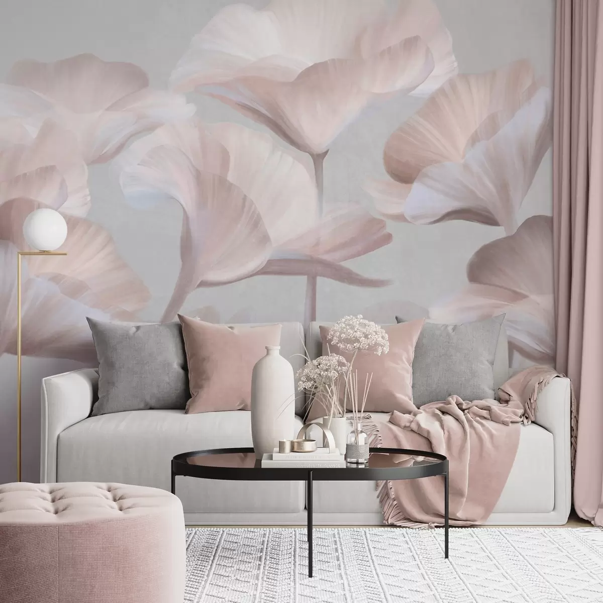 Papier peint photo Fleurs de lotus translucides à la texture pêche pâle, aux pétales délicats, sur fond gris discret. N° w09640