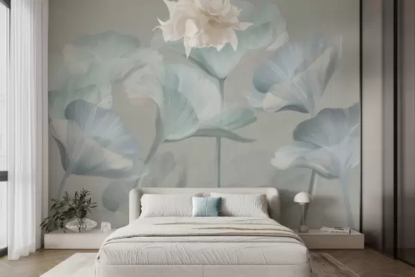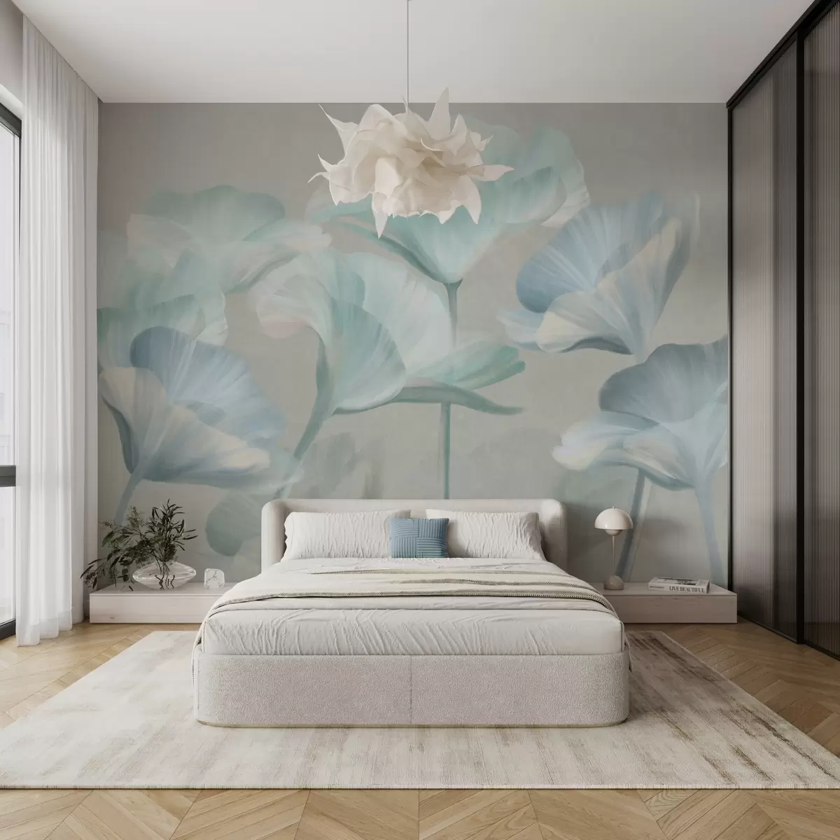 Papier peint photo Fleurs de lotus translucides texturées, de couleur turquoise pâle, aux pétales délicats, sur fond gris discret. N° w09640v2