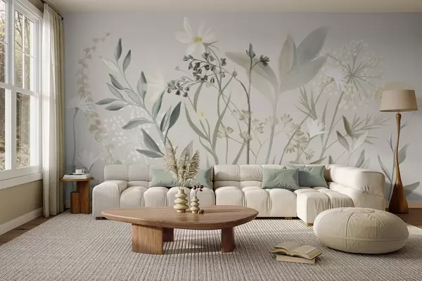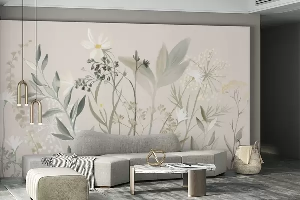 Papier peint photo Fleurs sauvages et feuillage délicatement texturés dans des tons verts et crème discrets sur un fond beige clair. N° w09641