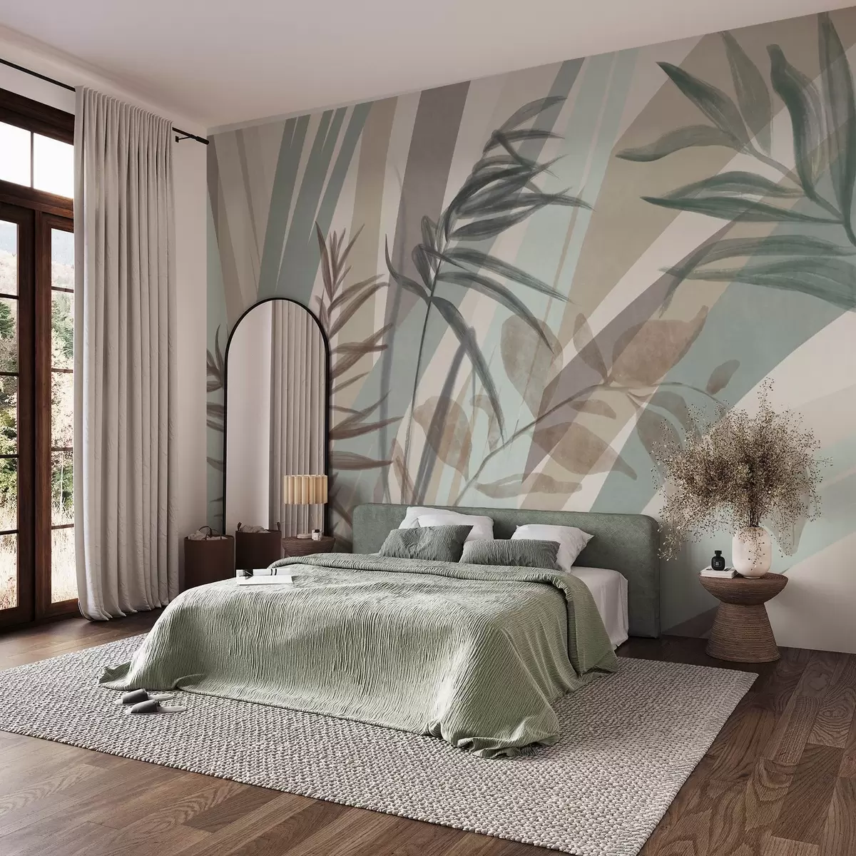 Papier peint photo Hautes herbes texturées et feuilles dans des tons terreux discrets, avec des lignes abstraites en arrière-plan, créant un imprimé organique. N° w09643